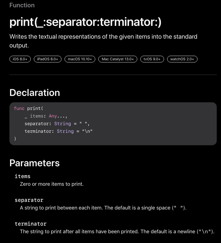 함수의 선언(Declaration)부분을 보면, items, separator, terminator 3가지의 매개변수를 사용하는 것을 알수 있다.